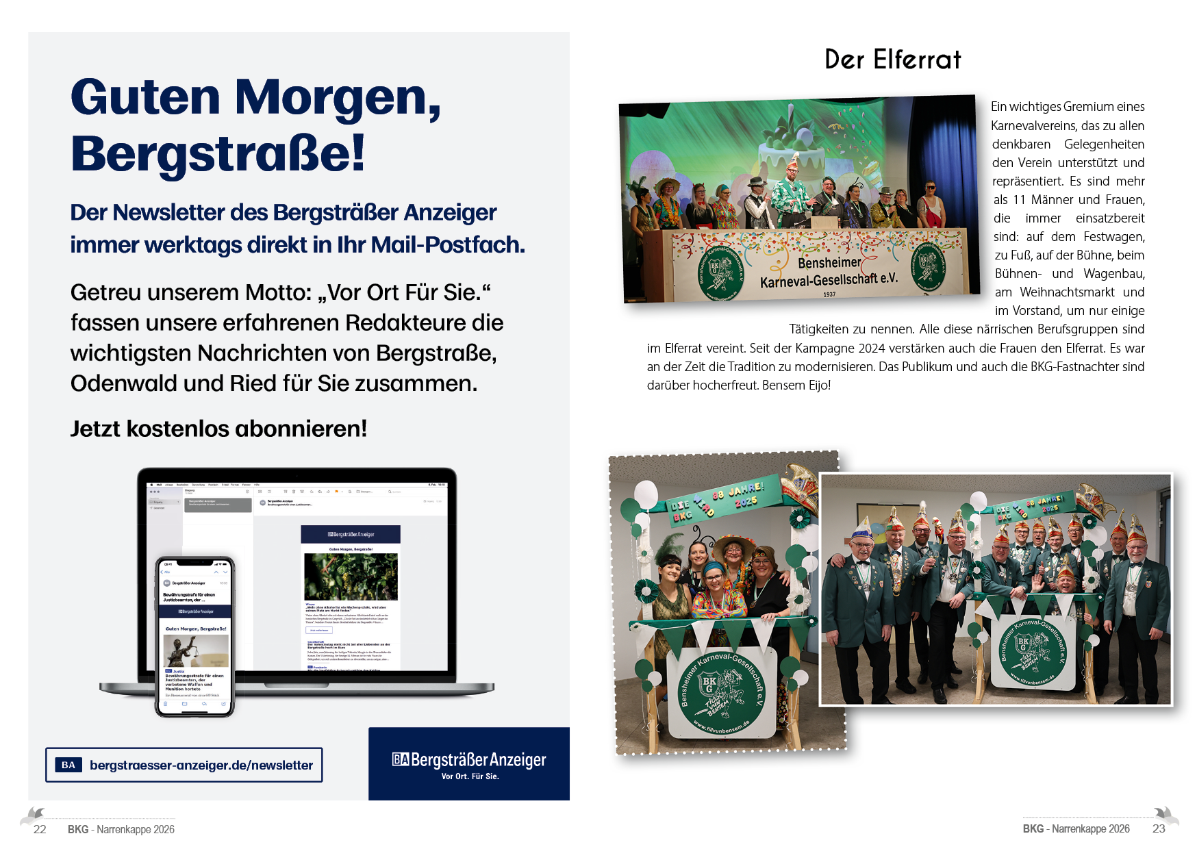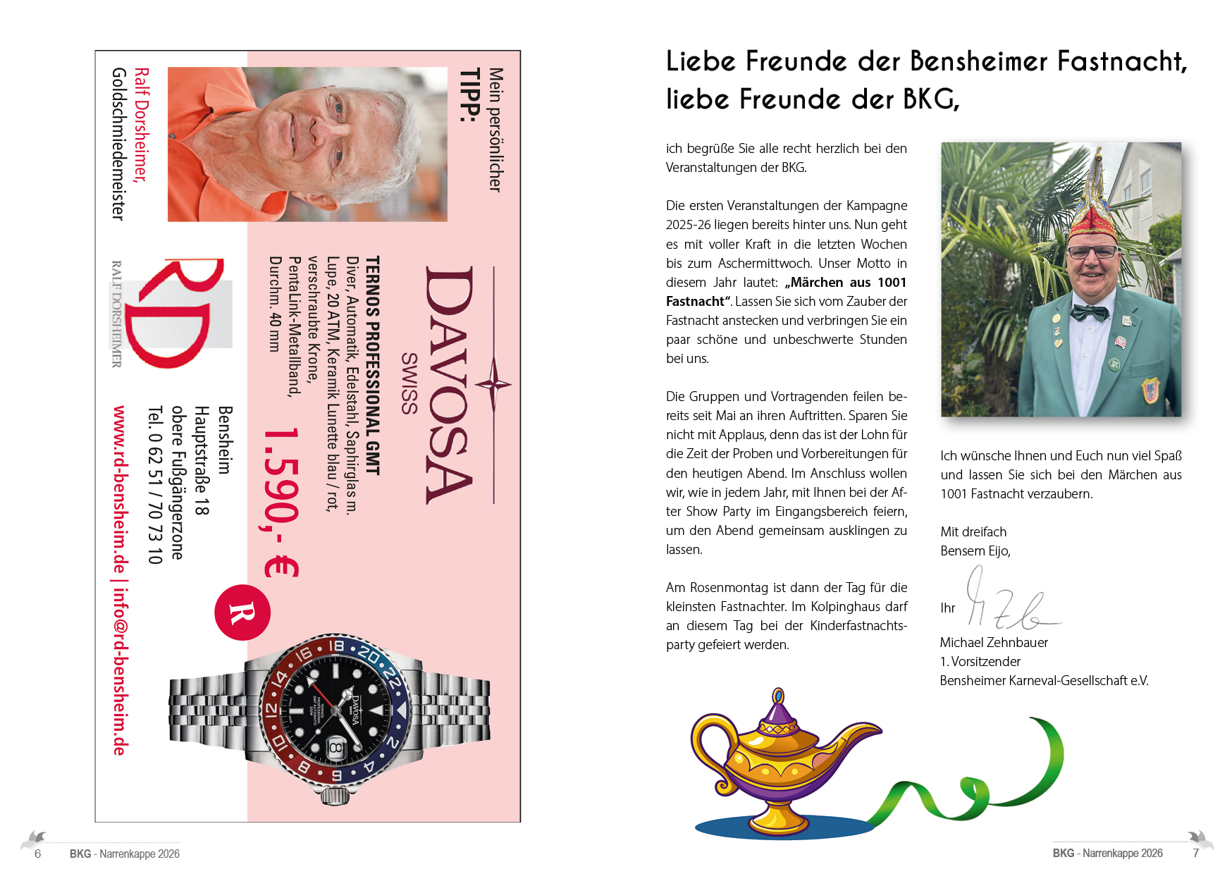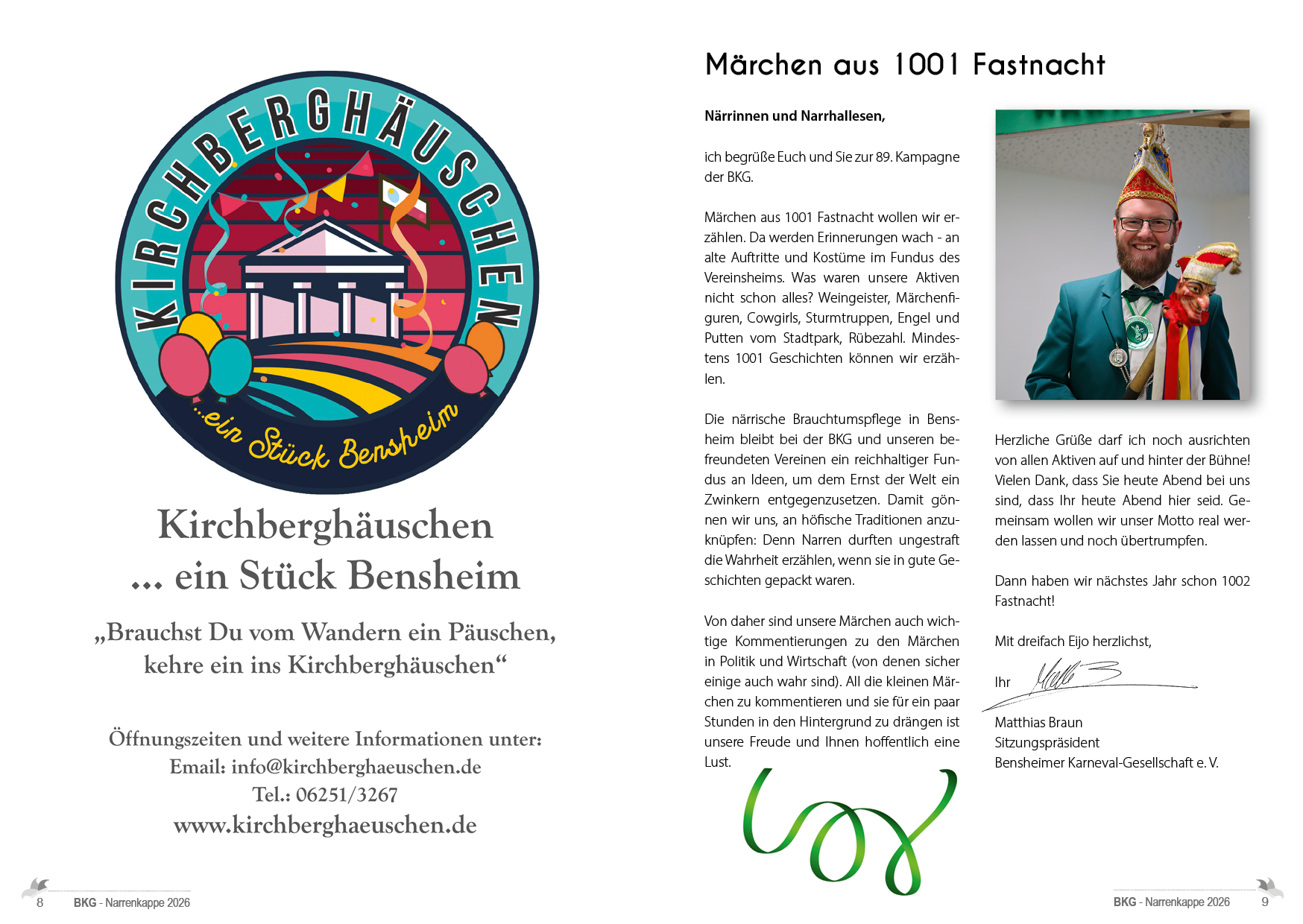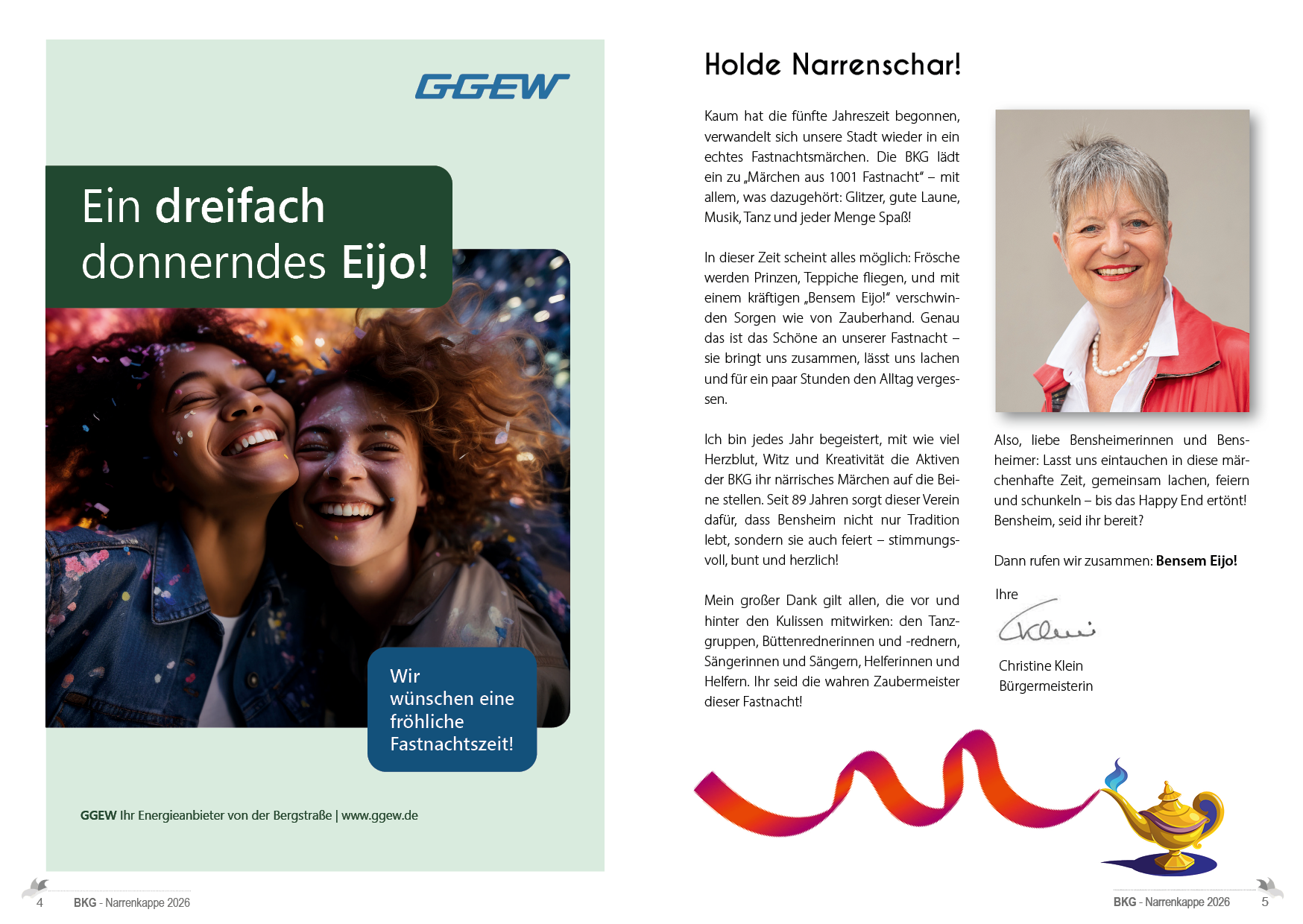 Wir freuen uns darauf, mit Euch in dieser Kampagne Märchen aus 1001 Fastnacht zu durchleben. Wir lassen es bei unseren Elferratssitzungen am 24. und 31. Januar 2026 im Kultur- und Kongresszentrum Bensheim (ehemals Bürgerhaus) wieder krachen. Nach den Sitzungen steigt unsere After-Show-Party. Wir freuen uns auf euch.
