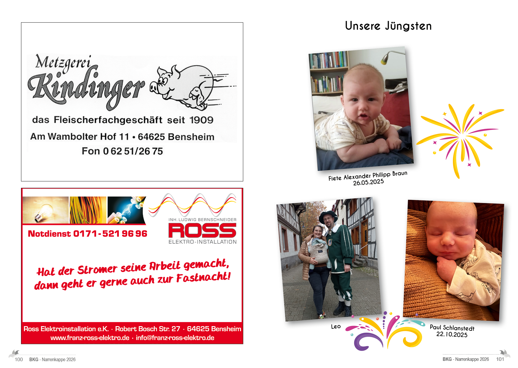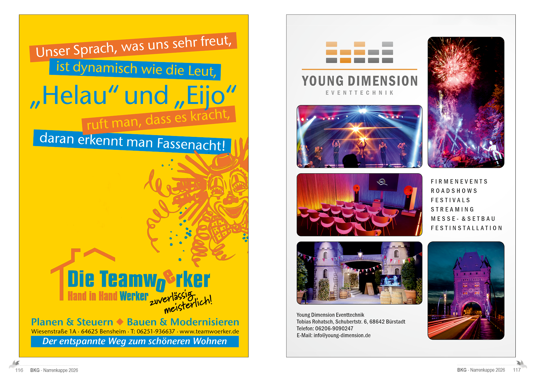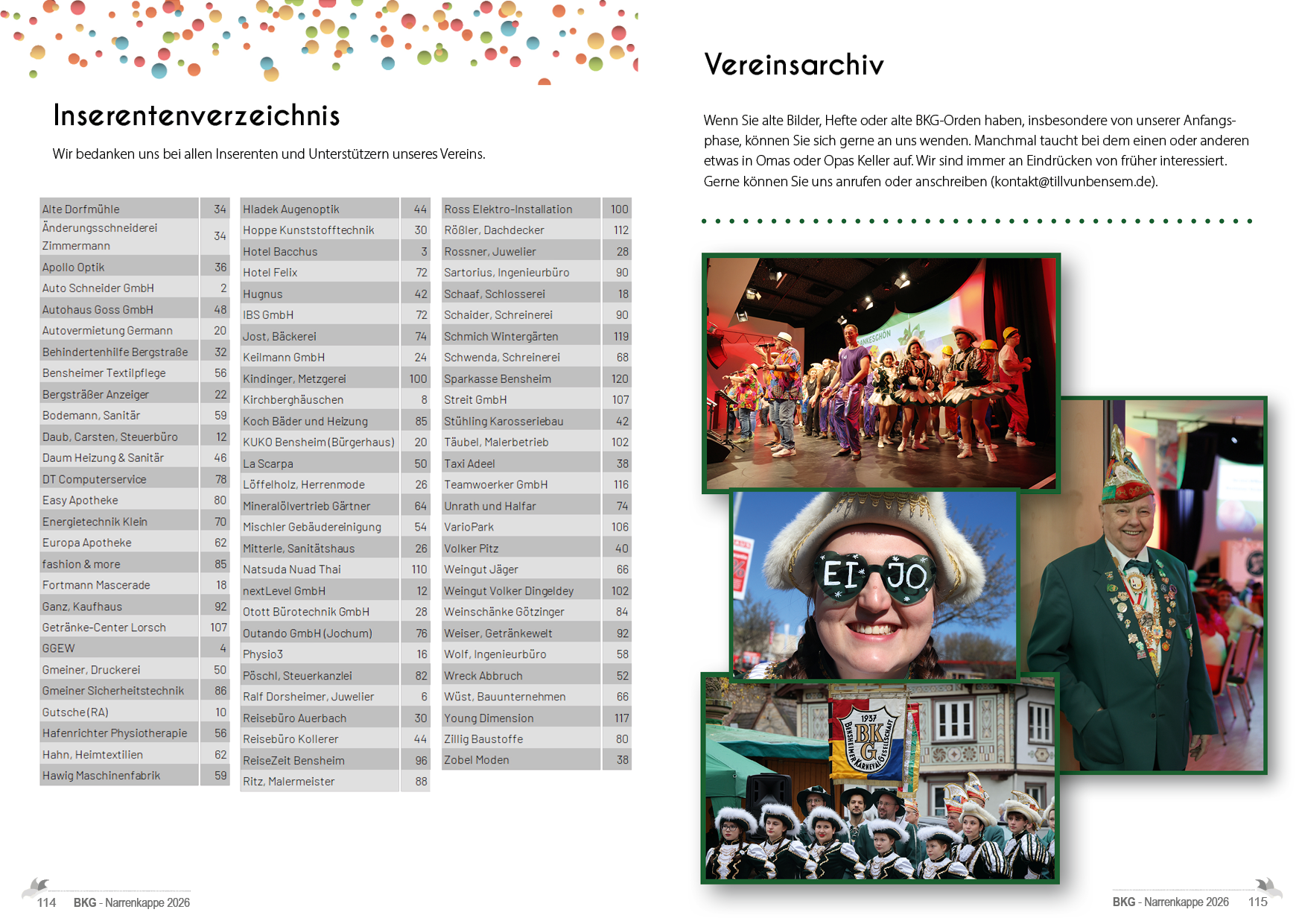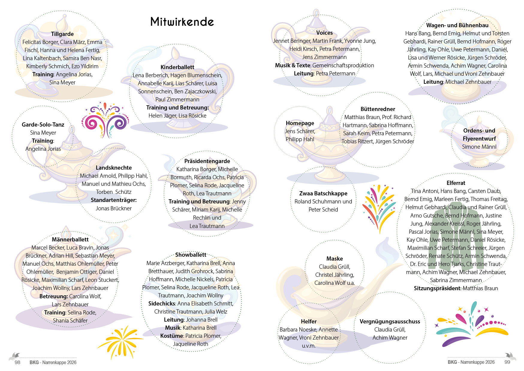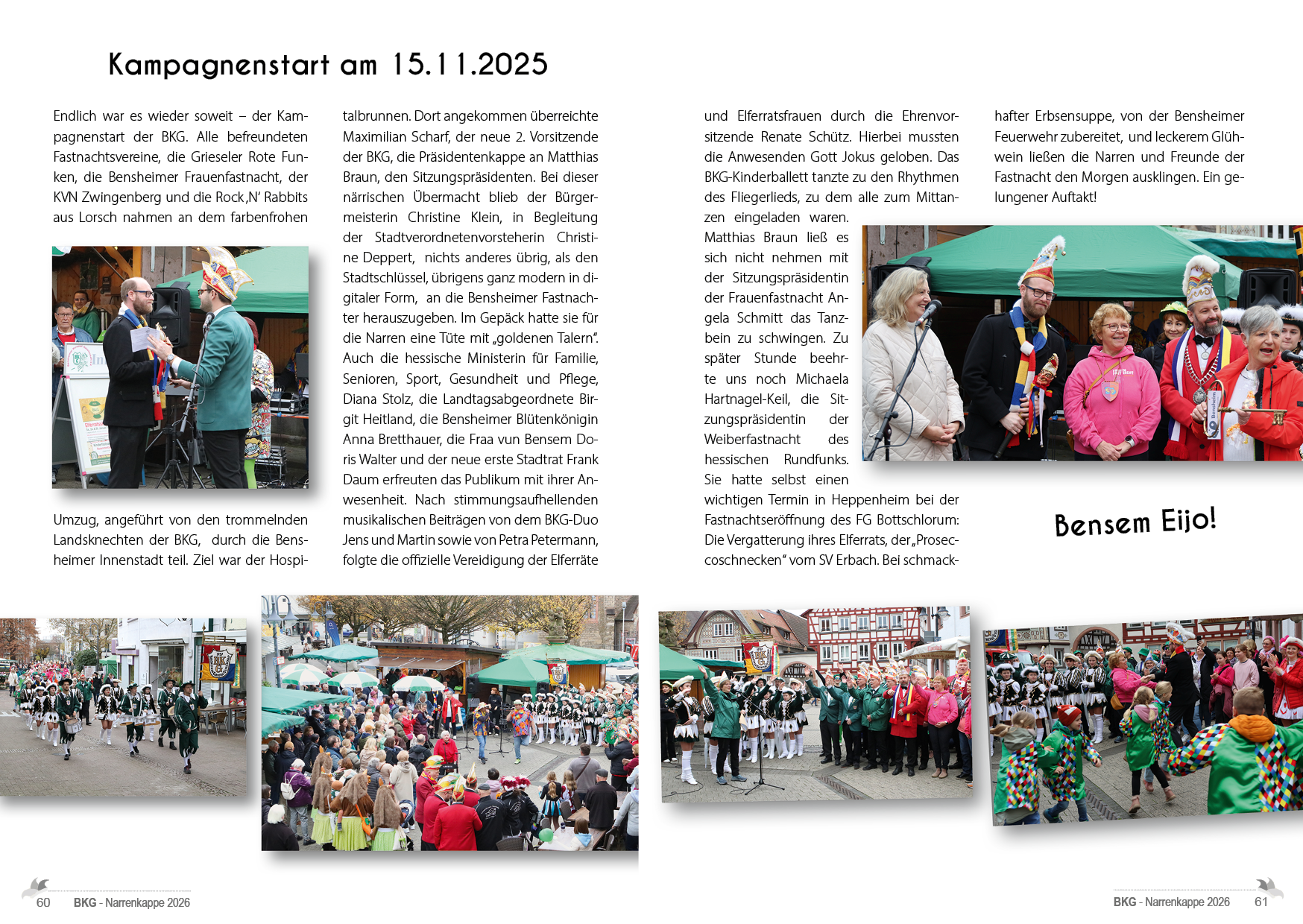 Wir freuen uns darauf, mit Euch in dieser Kampagne Märchen aus 1001 Fastnacht zu durchleben. Wir lassen es bei unseren Elferratssitzungen am 24. und 31. Januar 2026 im Kultur- und Kongresszentrum Bensheim (ehemals Bürgerhaus) wieder krachen. Nach den Sitzungen steigt unsere After-Show-Party. Wir freuen uns auf euch.